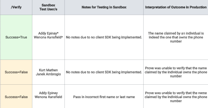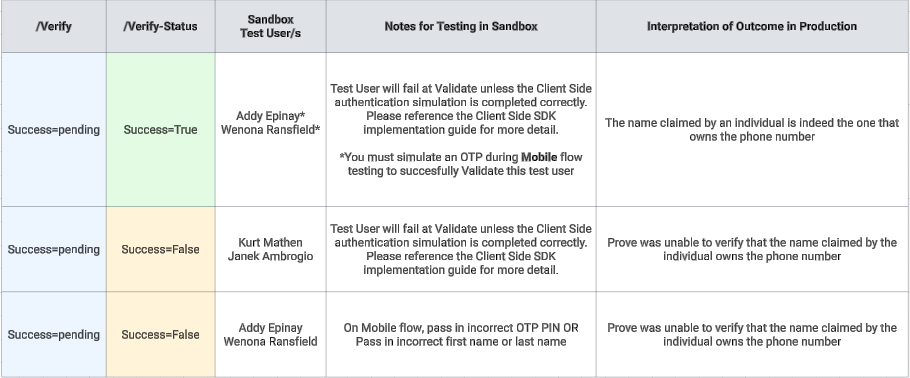 The following tables provides outcome possibilities including which sandbox users to test with and interpretations of each success and failed state in Production. The Test Users table has the comprehensive list of test users including mock data.Verified Users With Possession